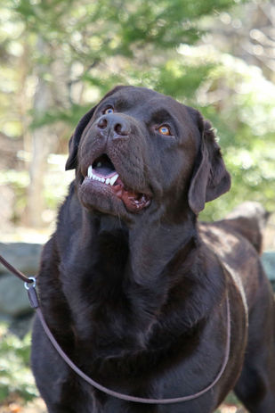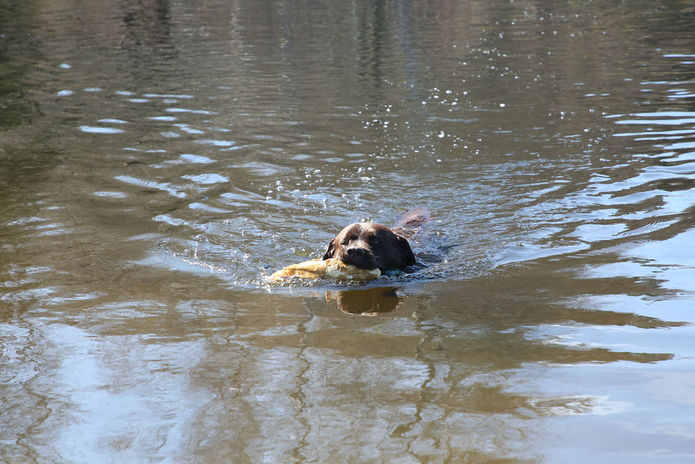 Louder is a sweet, friendly, and enthusiastic boy. He is happy and showy and loves to retrieve in fields and water. His coat is fabulously dark and thick, and his correct otter tail is an excellent rudder. Overall, a lovely balanced chocolate boy!